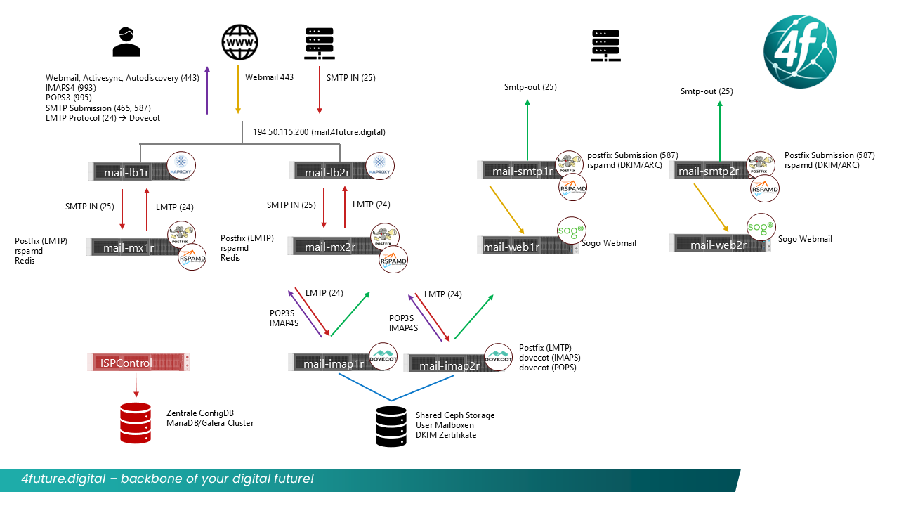 Speicherung aller Postfächer im ausfallsicheren Ceph-Cluster.