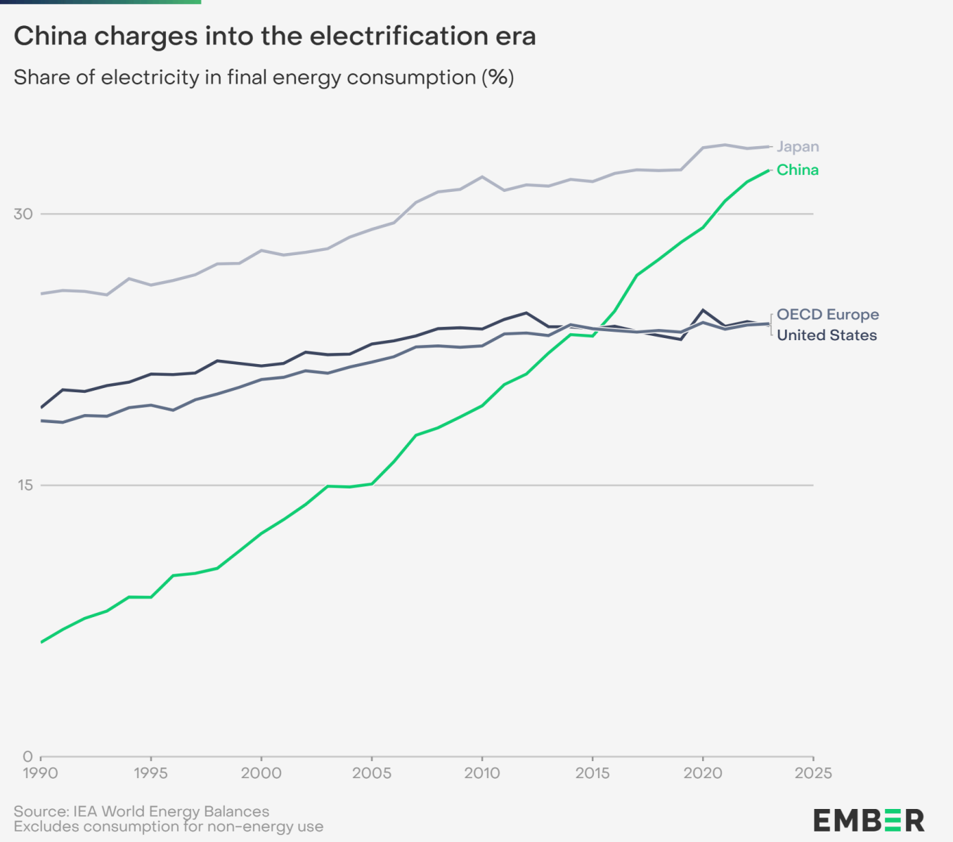 Ateil an Eletrizität im Gesamtenergieverbrauch China vs. OECD Europa & US