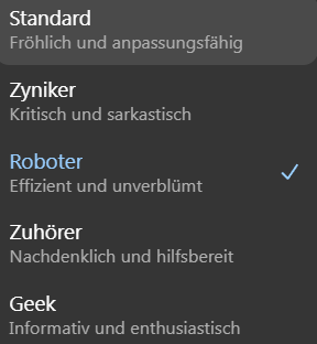 Ich habe gerade gelernt, dass man ChatGPT in unterschiedliche Modis verstetzen kann, damit es nicht alles mit dem Brustton der Überzeugung sagt. Es gibt folgende Modi in die Man ChatGPT 5 versetzen kann (erklärt durch ChatGPT selbst)