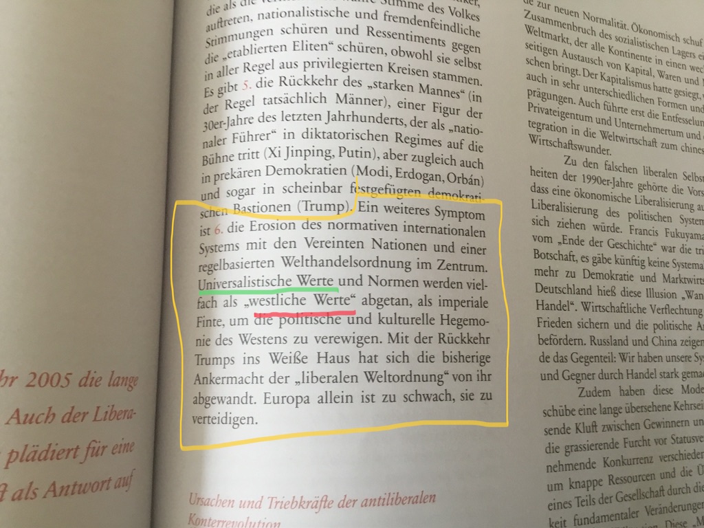 Die Frage liegt auf der Hand: Tappen wir mit unserem Beharren auf „europäische Werte“ in dieselbe Arroganzfalle? Widerspricht das nicht unserem Selbstbild einer offenen, demokratischen und global vernetzten Weltgesellschaft? Reproduzieren wir nicht genau den christlich-westlich-europäischen Überlegenheitsgestus, den wir eigentlich hinter uns lassen wollten?