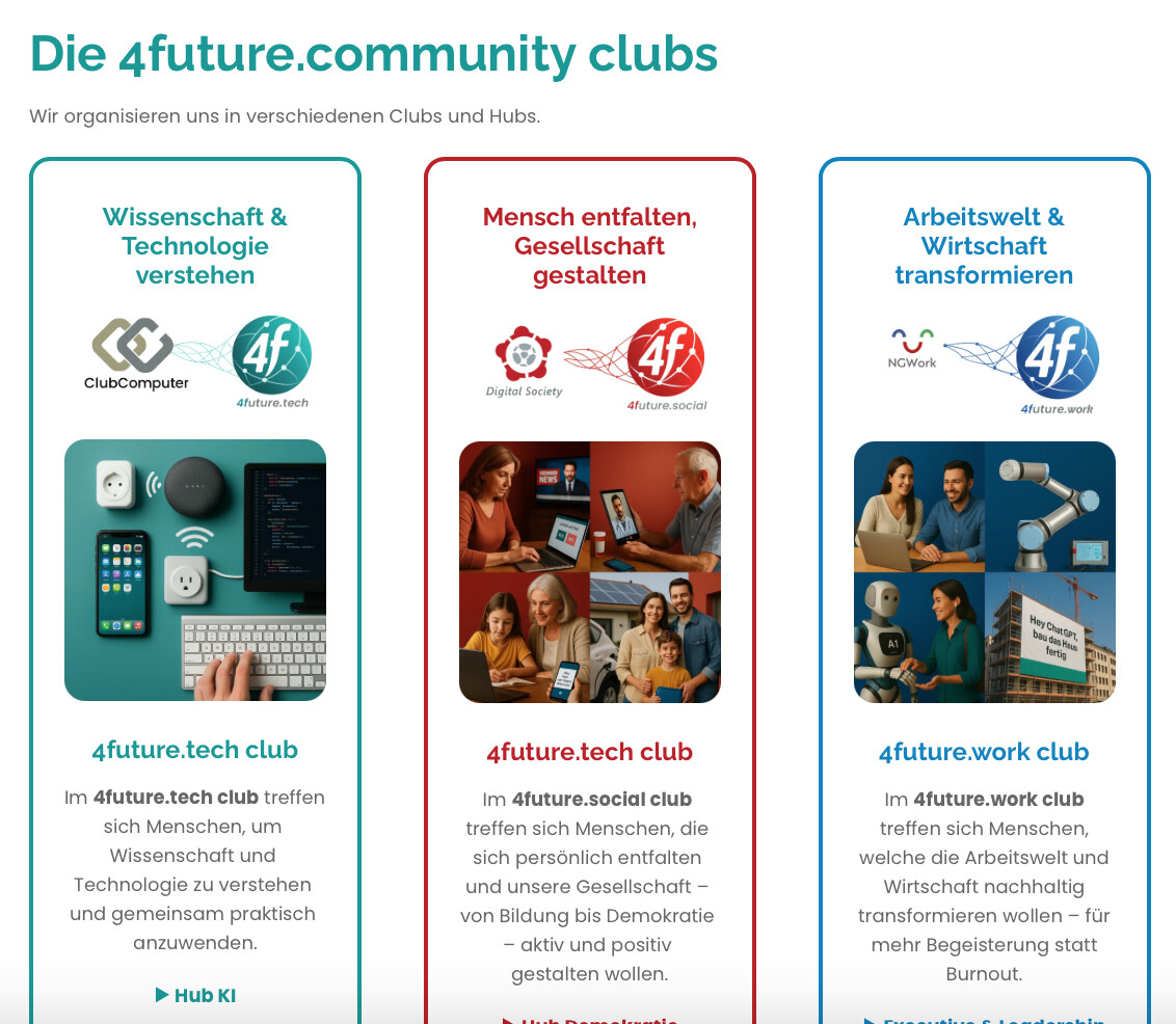 Wir überarbeiten derzeit die Startseite von 4future.community. Hintergrund: Neben der Digital Society und dem NGWork Club ist jetzt auch der ClubComputer auf der Seite integriert.