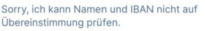 Wenn bei der Prüfung keine Übereinstimmung von IBAN und Kontoinhaber festgestellt wird, lautet die Fehlermeldung in etwa: