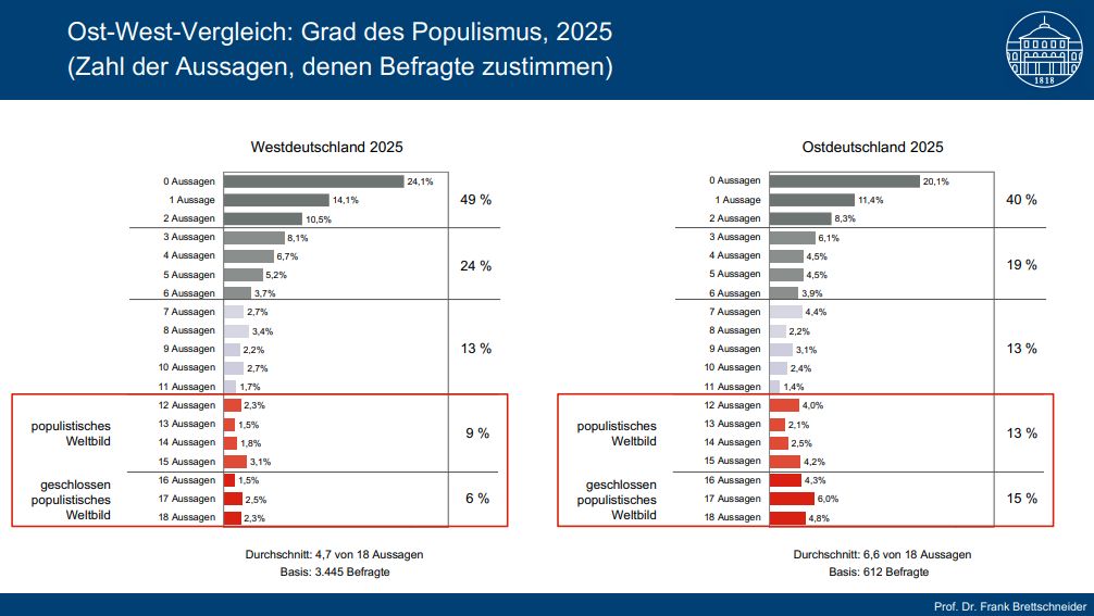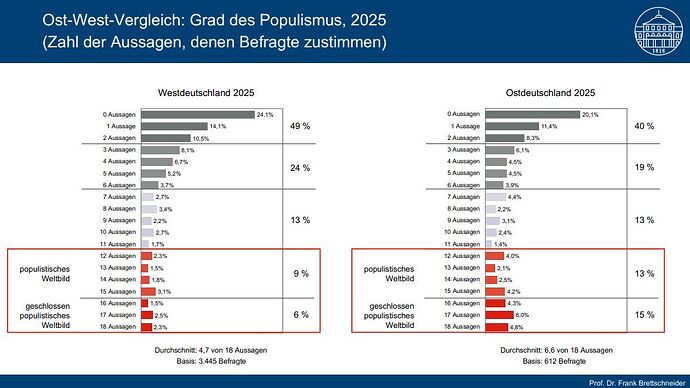 Der Text macht klar, dass klassische Erklärungen für den AfD-Erfolg – etwa Wirtschaftslage, Infrastruktur oder ostdeutsche Transformationserfahrungen – nur einen Teil des Bildes liefern. Neue Daten zeigen, dass ein geschlossen populistisches Weltbild viel stärker wirkt als bisher angenommen. Es ist im Osten deutlich verbreiteter und prägt die große Mehrheit der AfD-Anhänger. Menschen mit diesem Weltbild misstrauen Politik, Medien, Wissenschaft und Justiz fast vollständig und informieren sich überwiegend in sozialen Medien und abgeschotteten Kommunikationsräumen.
