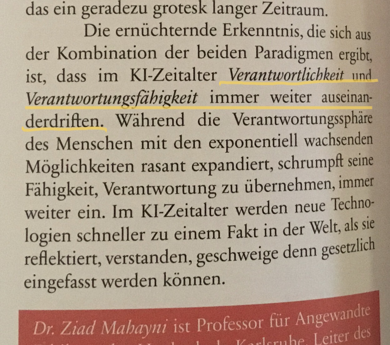 Diese würden dazu führen, dass der Mensch gar nicht mehr mitkommen würde und sich daher in dem Dilemma befinden würde, zwar verantwortlich für die Technologie, deren Einsatz und Folgen zu sein, aber gar nicht mehr fähig wäre, dieser Verantwortung noch Nachkommen zu können.