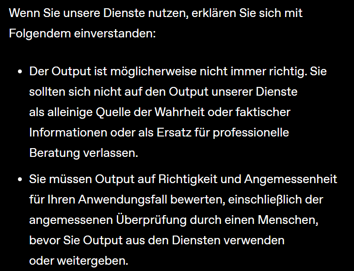 Übersehen wird in der Diskussion über die Alltagstauglichkeit von KI-Systemen auch der Umstand, dass viele ( vielleicht sogar alle ?) Anbieter von KI- Systemen bzw .- Services in ihren “Gebrauchsanleitungen” für den Einsatz von KI (bzw. den entsprechenden Abschnitten ihrer Serviceverträge ) für die von ihnen angebotenene KI-Dienstleistungen bzw. - Systeme die Weiter-Verwendung von KI-Ergebnissen ohne vorherige sorgfältige Prüfung/Kontrolle jedes Ergebnisses, aber auch von Ergebnissen mit möglichen negativen/nachteiligen Auswirkungen für betroffene Personen, ausdrücklich untersagen.