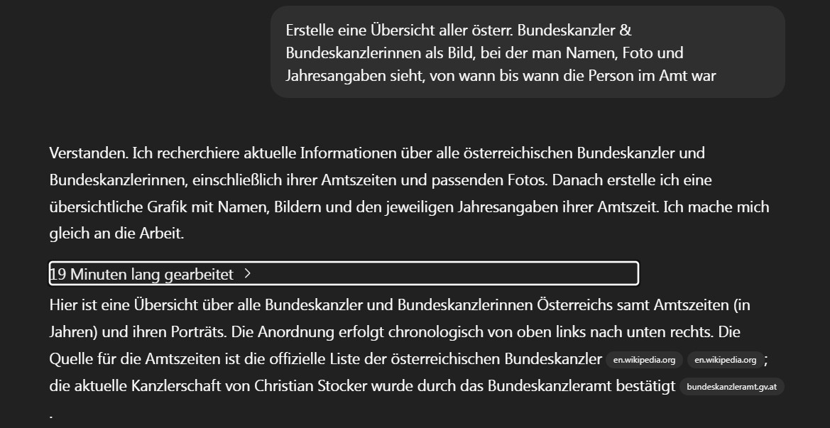 Das Problem hier ist dass die Leute nicht verstehen, wie die Bildgenerierung funktioniert. ChatGPT hat da nämlich davor die Liste der BundeskanzlerInnen korrekt ausgegeben.